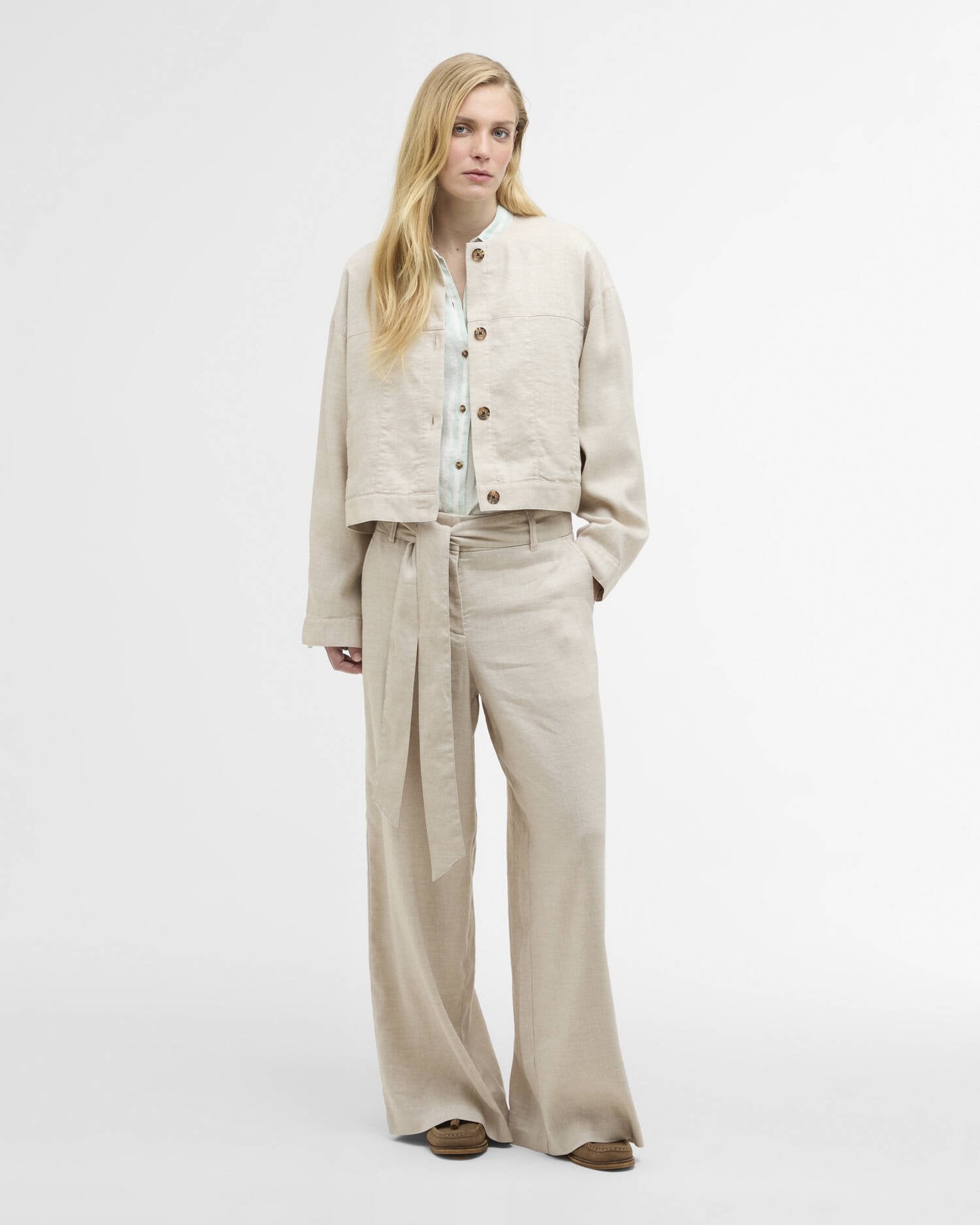 The Barbour Gabby Collarless Overshirt in Mist offers effortless sophistication with a relaxed, oversized fit crafted from a premium linen blend. Designed with mock horn button fastening, refined seam detailing, and a slim ID bar at the waistband, this versatile piece blends timeless tailoring with contemporary ease - perfect for layering across seasons in true Barbour style.