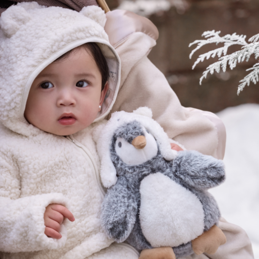 Meet the perfect winter companion—a soft, huggable penguin plush dressed in a cozy, removable mini polar bear aviator hat. This charming toy makes for an adorable pairing with your little one, who can match in a baby-sized polar bear knit hat. Together, they'll be ready for frosty adventures and endless cuddles.