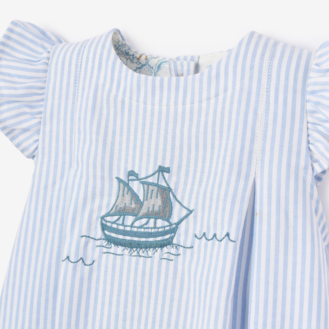 A timeless summer classic, this boat-embroidered oxford stripe A-line dress is crafted from crisp cotton for breezy, all-day comfort. Delicate ruffle sleeves add a touch of sweetness, making it perfect for seaside adventures and special moments alike.