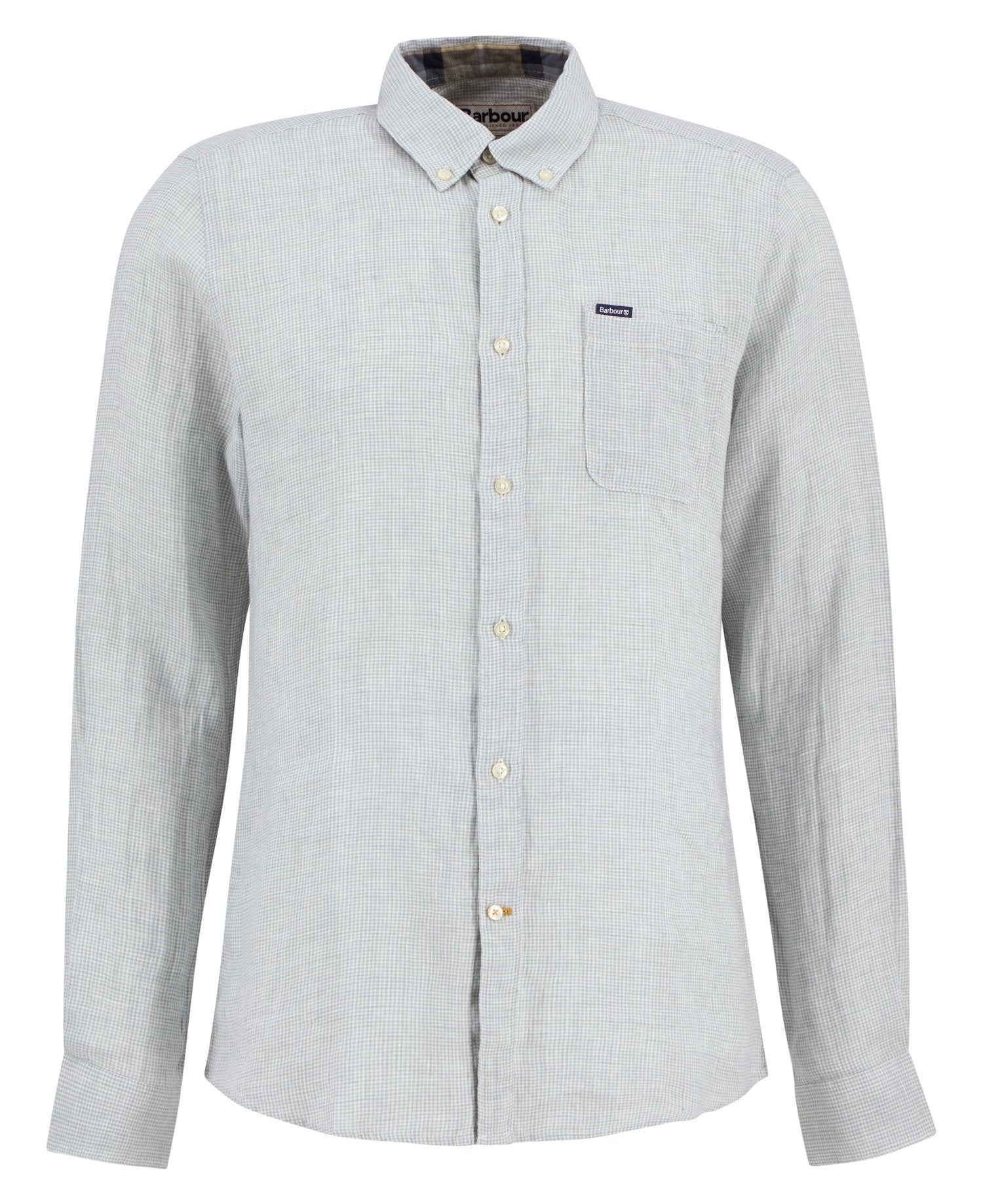Exuding contemporary refinement, this Barbour Linton Tailored-Fit Shirt in Slate is crafted from 100% linen in a micro houndstooth weave with a soft finish. This long-sleeved garment is simply detailed with a button-down collar and a branded Barbour flag to the side seam.